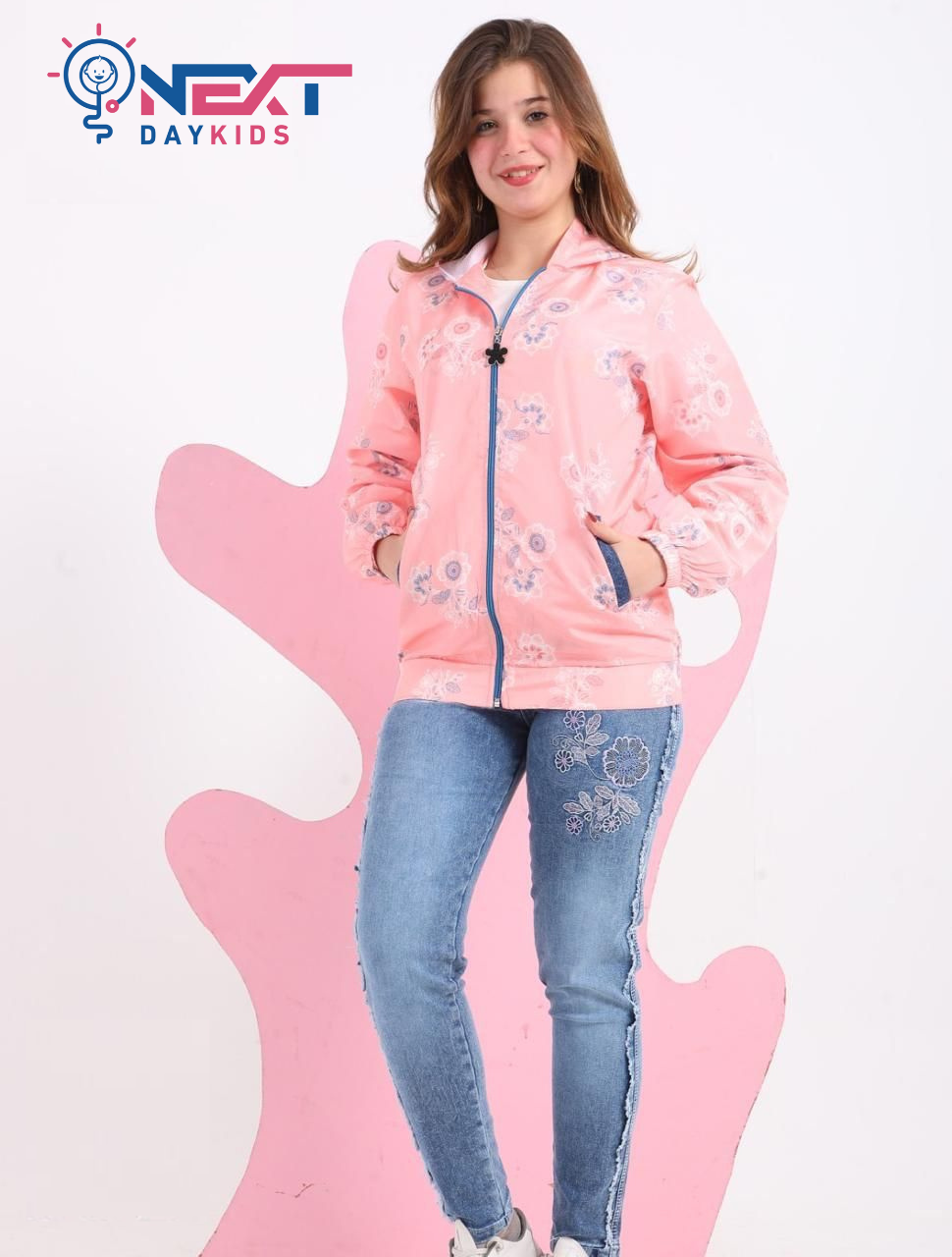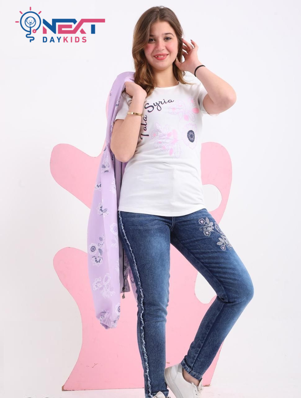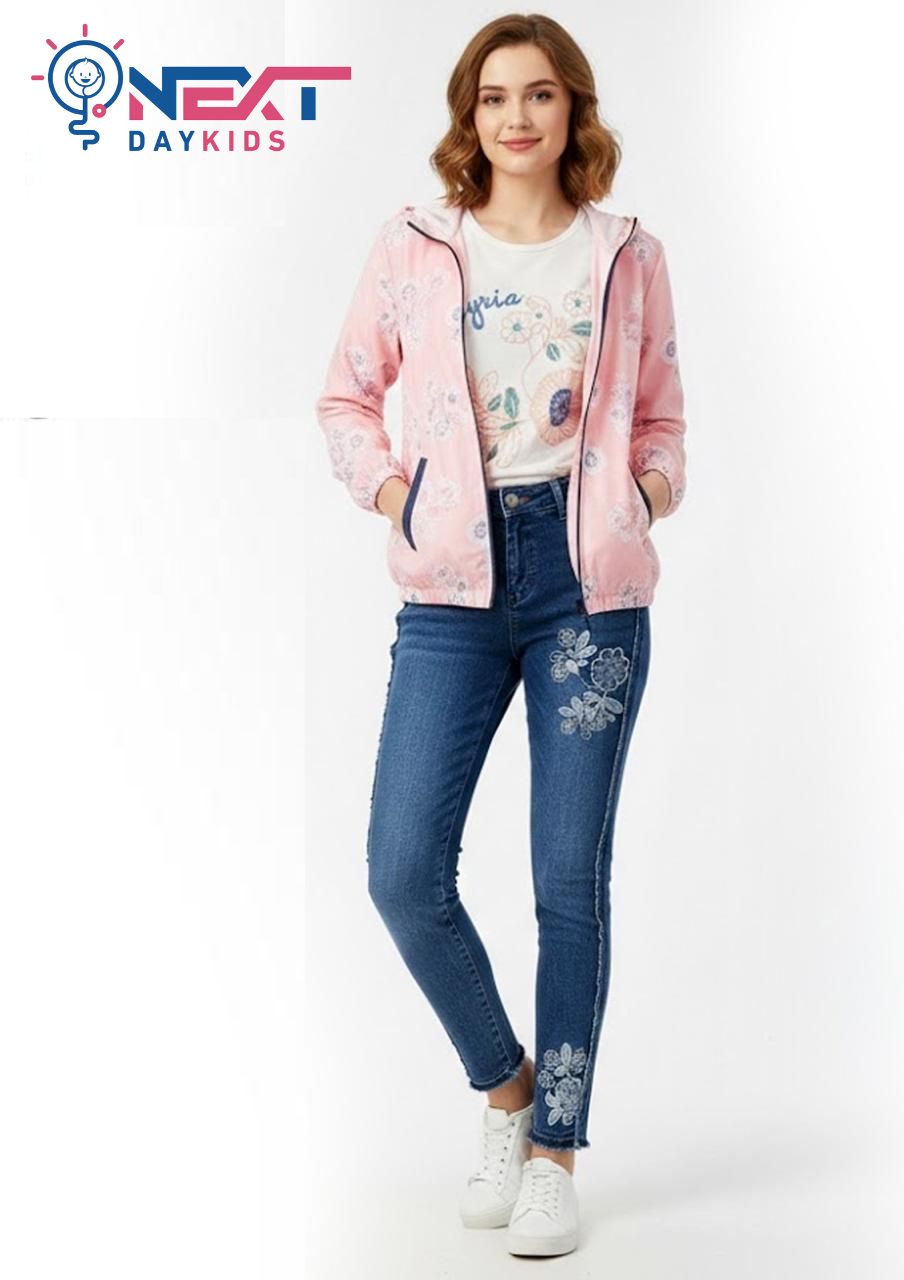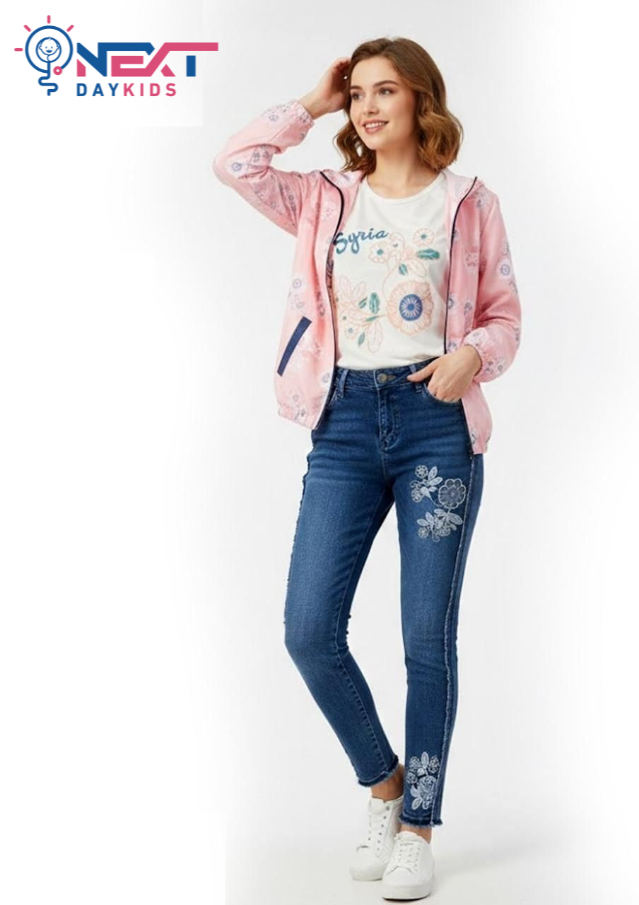 طقم “Lavender Blossom” الكاجوال: إطلالة عصرية مريحة تجمع بين تيشيرت قطني أبيض مزين بنقشات الزهور، وجاكيت “سوفت شيل” باللون الأرجواني الهادئ المزود بقلنسوة (Hoddie) وسحاب عملي. يكتمل الطقم ببنطلون جينز أزرق عالي الجودة يتميز بتطريزات وردية أنيقة وتفاصيل “فرينج” عصرية على الجانبين، مما يجعله الخيار المثالي للفتيات اللواتي يبحثن عن الأناقة والراحة في خروجاتهن اليومية.