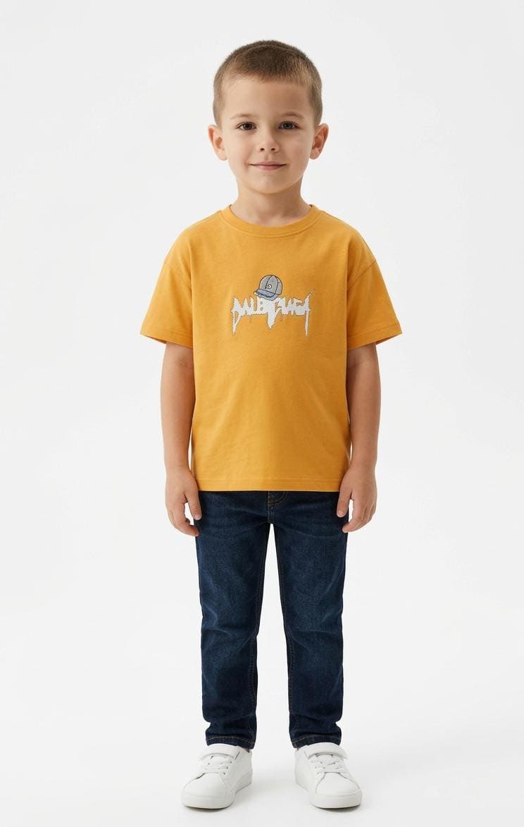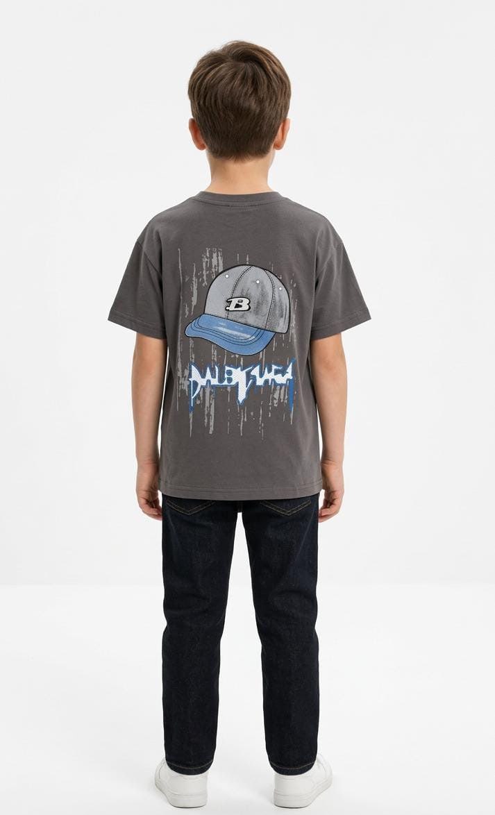 تيشيرت أولادي مصنوع من خامة برسولا مستورد، بتصميم عصري مع رسمة قبعة مميزة على الصدر. مثالي للأطفال من عمر سنة إلى خمس سنوات.