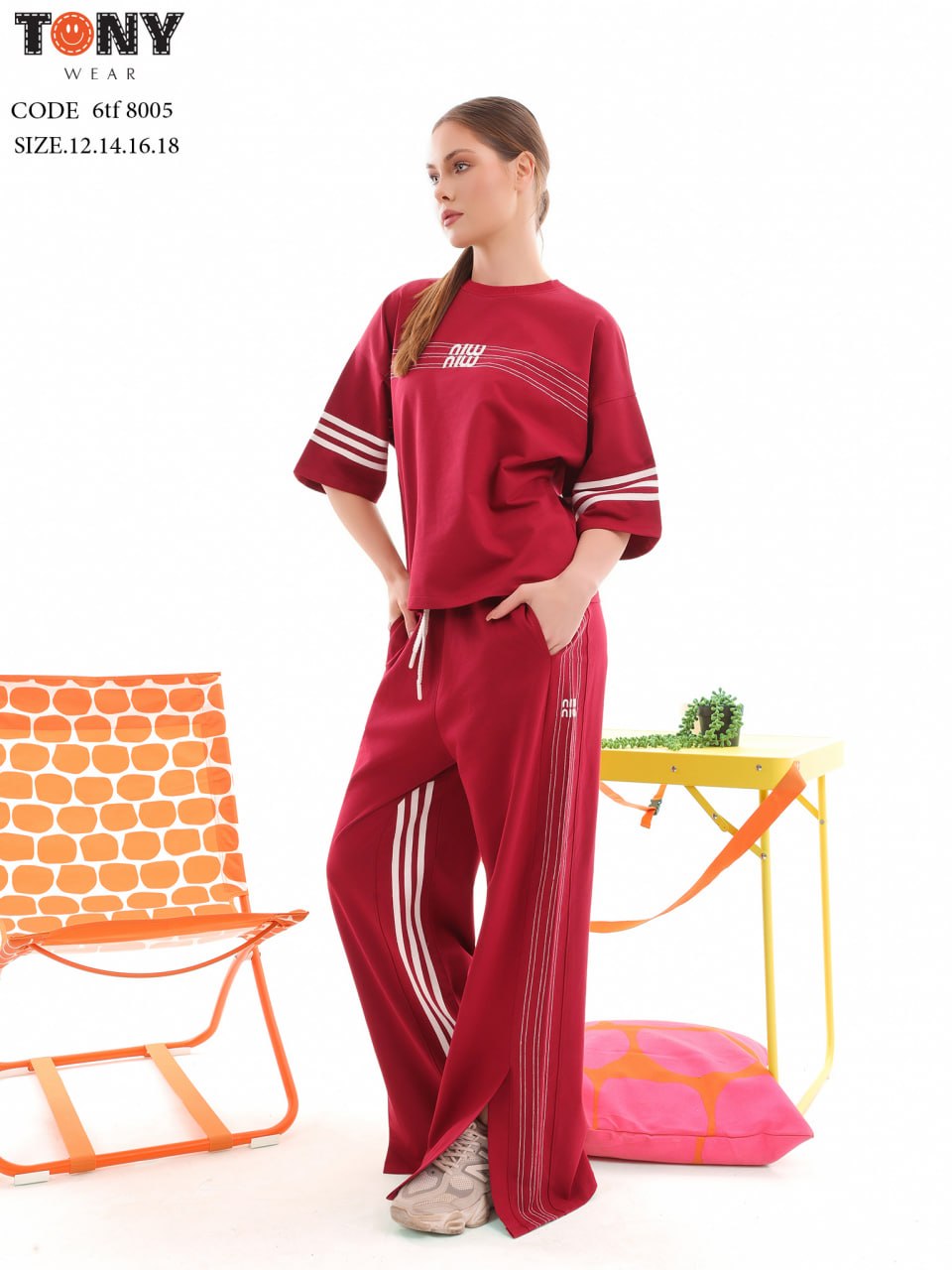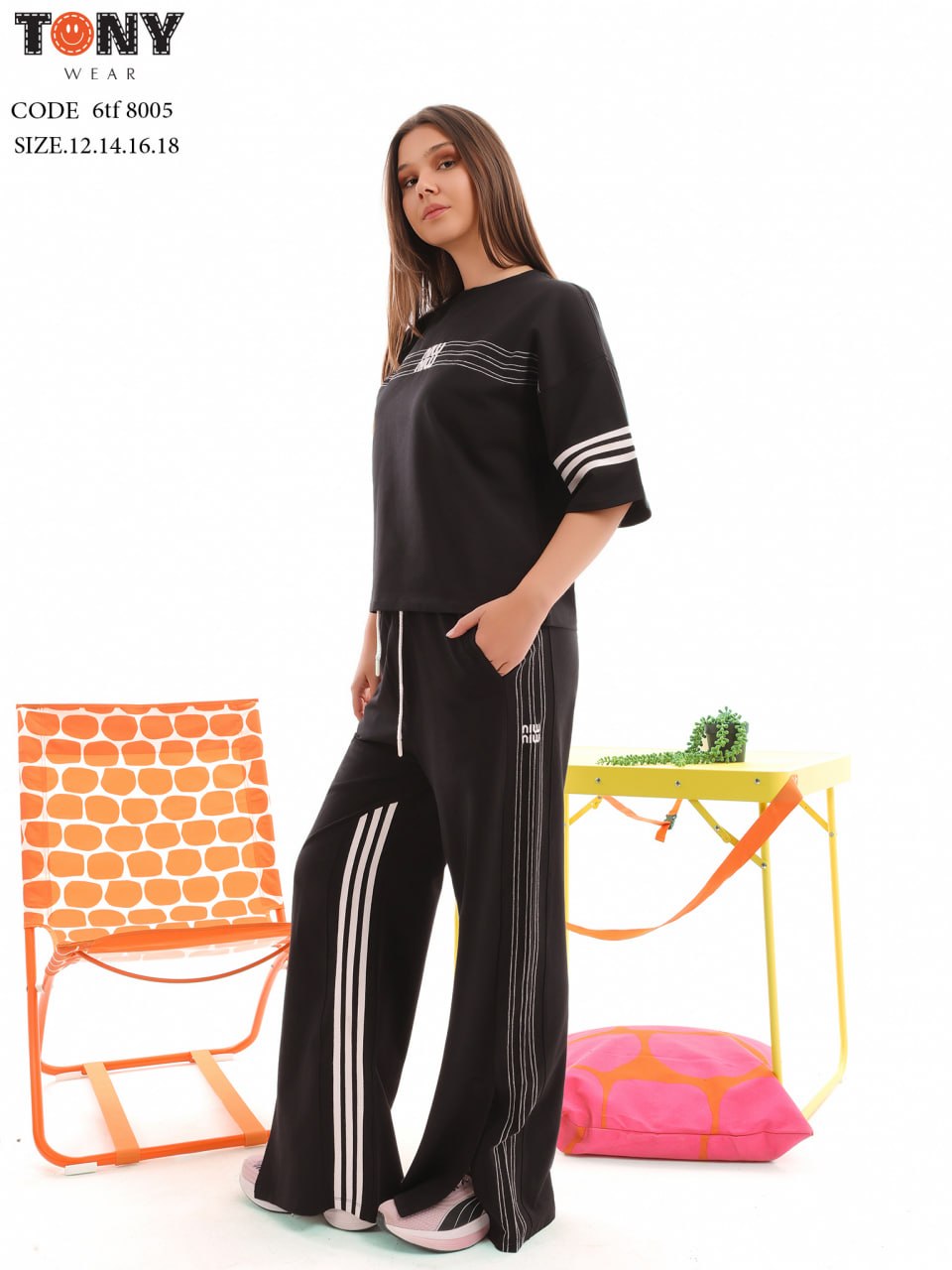 طقم بناتي بتصميم جارسونيه مصنوع من قماش السمر قطن. يتميز بقصة مريحة وخطوط جانبية رياضية، مثالي للمناسبات غير الرسمية.