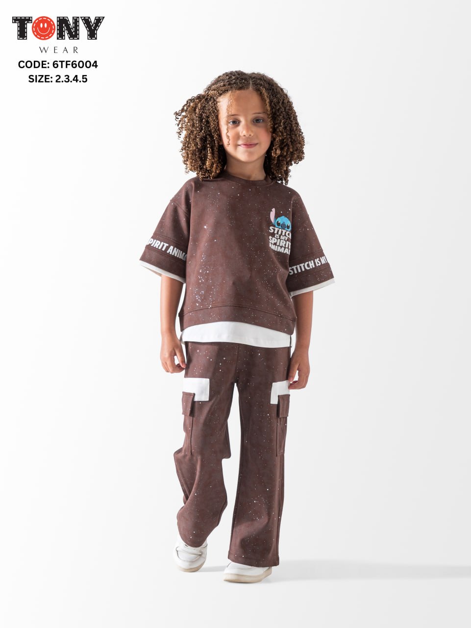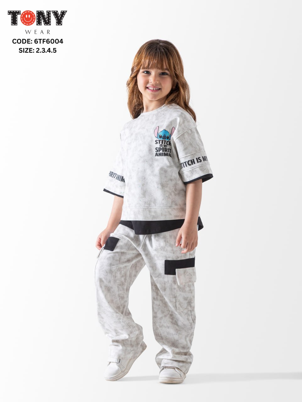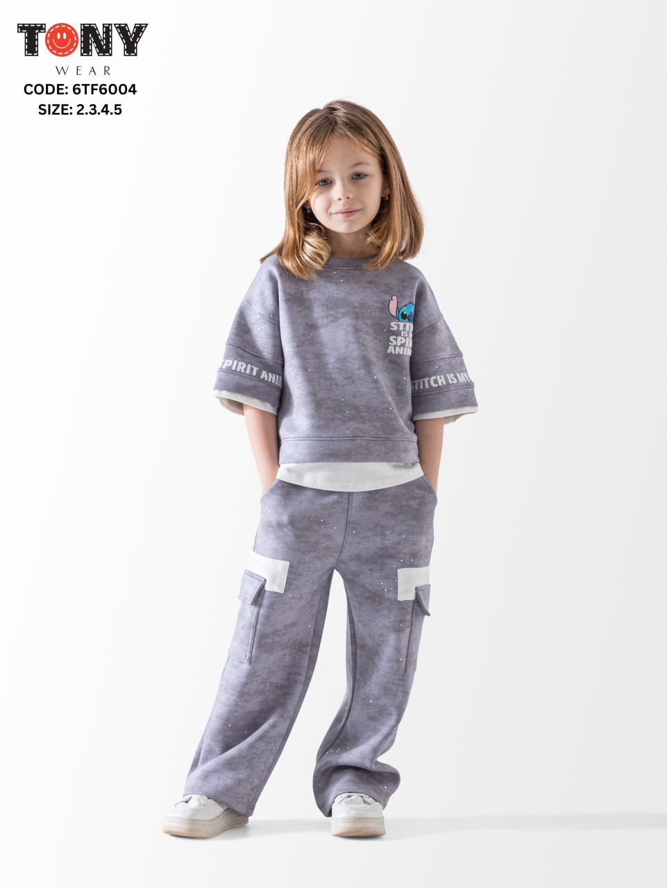 طقم رياضي بناتي يتكون من قميص بولو وبنطلون واسع. التصميم يحتوي على رسومات مبهجة، والخامة طبي سترس مريحة ومناسبة للحركة.