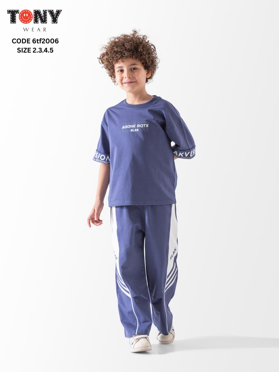 طقم أولادي مكون من تيشيرت وبنطلون مصنوع من قماش قطن سمر. التصميم مميز بشعارات على الأكمام والجوانب، مما يجعله مثالي للمناسبات الكاجوال.