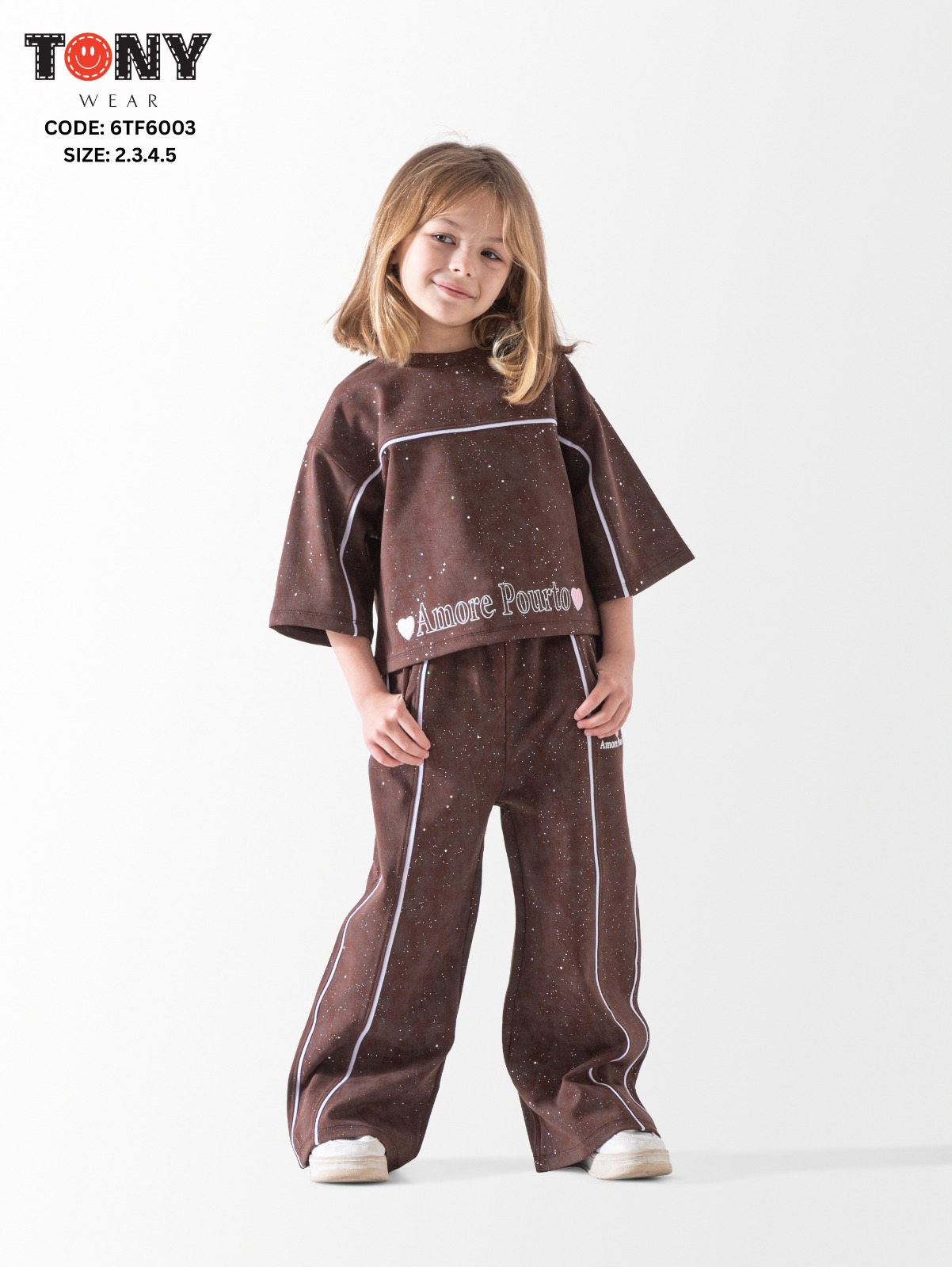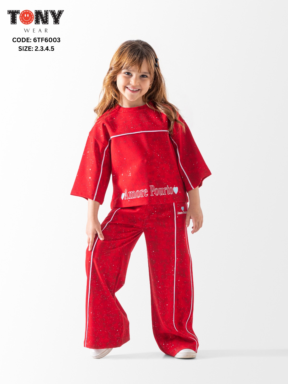 طقم بناتي أنيق مصنوع من خامة طبي سترس، مصمم بستايل مريح وواسع. مناسب للأطفال بعمر 2-5 سنوات.