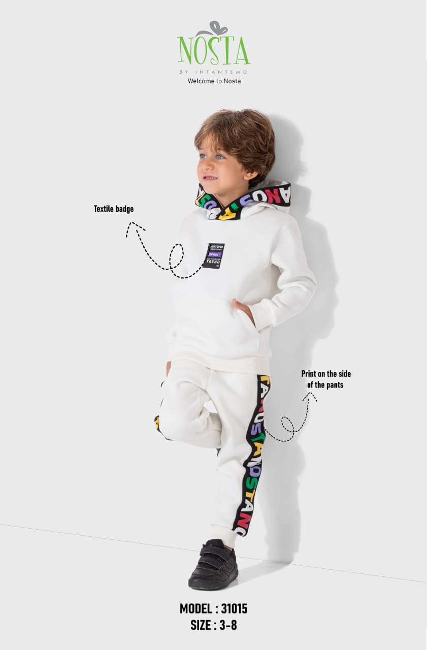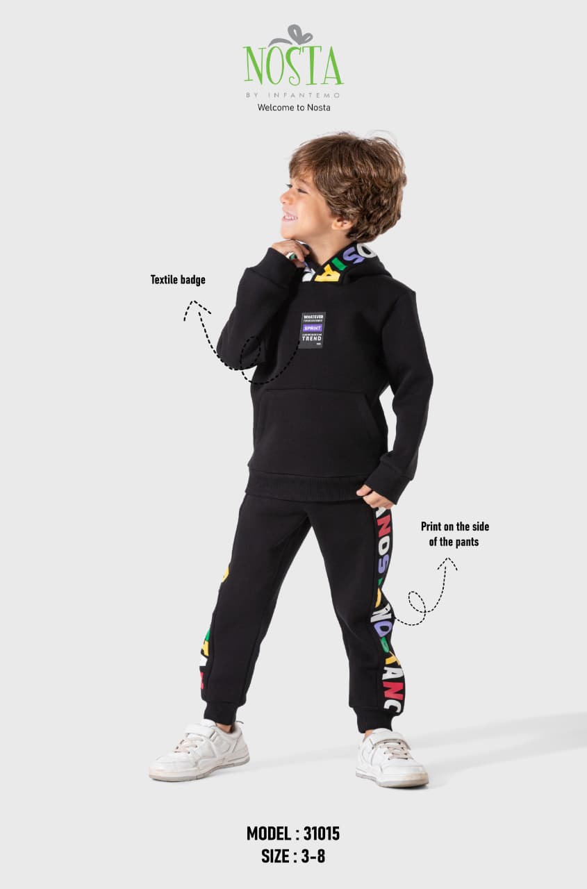 طقم شتوي أولادي قطعتين – هودي مع بنطال بطبعة جانبية ملونة