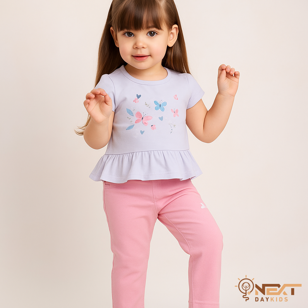 طقم أنيق يتكون من بلوزة قطنية مطبوعة بزهور جذابة بنمط بيبلوم، وبنطلون ليقنز مريح. مثالي للاستخدام اليومي والمناسبات غير الرسمية.
