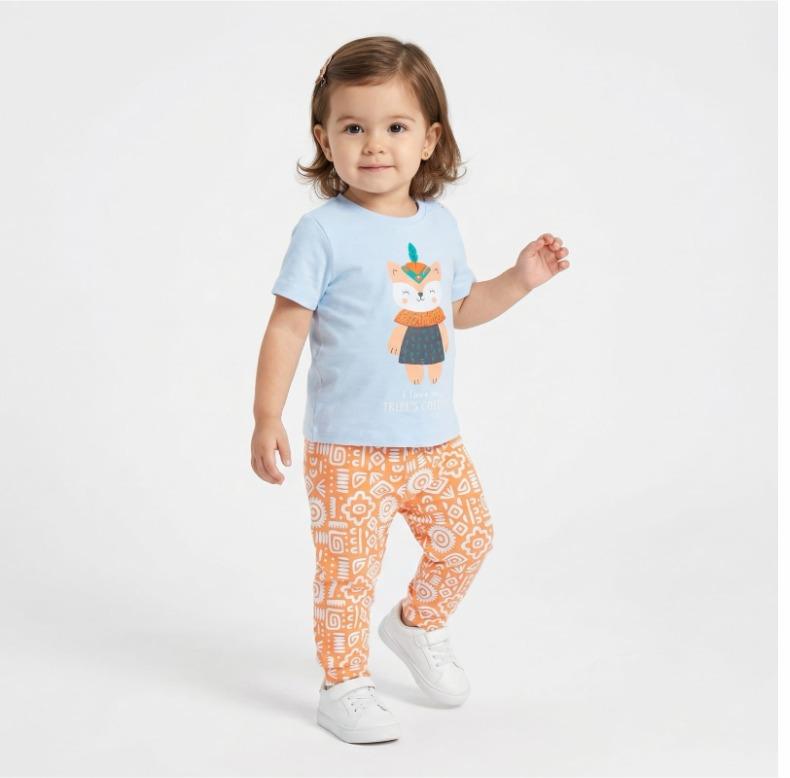 طقم ملابس مريح للأطفال يتكون من تيشيرت قطن برسوم مرحة وسروال مطبوع. مناسب للأيام المريحة والخروجات.