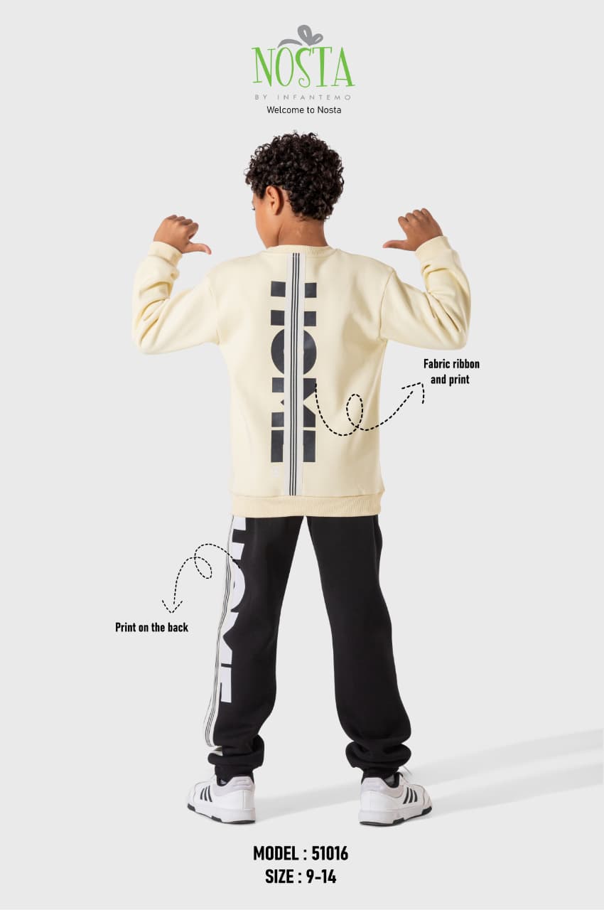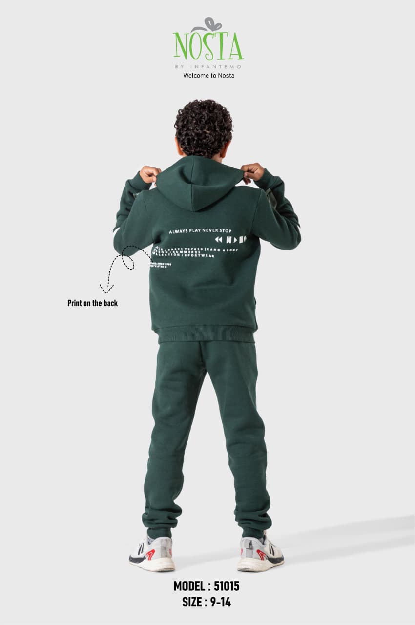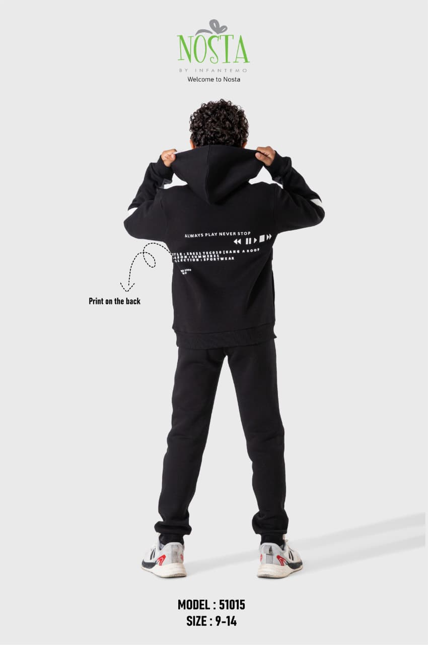 طقم شتوي شبابي رياضي أنيق، مناسب للنشاط اليومي واللعب. خامة دافئة وناعمة بتفاصيل مطبوعة على الظهر، وقصة عملية تحافظ على الراحة أثناء الحركة.